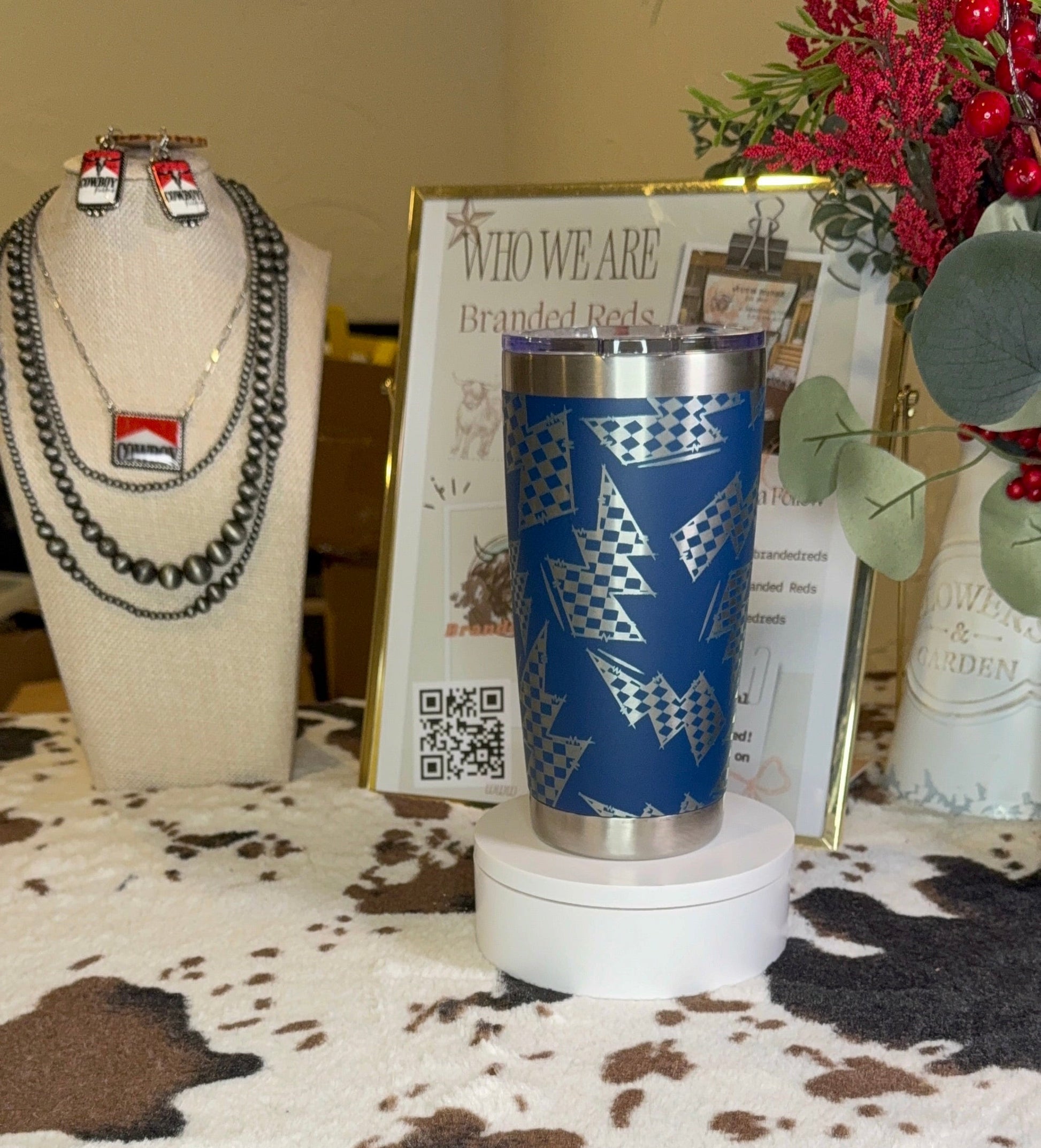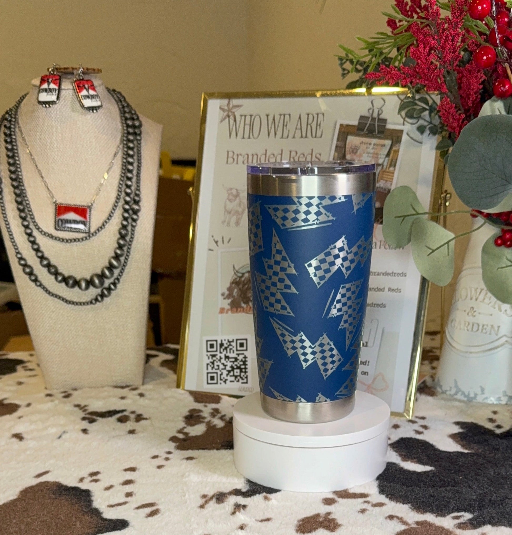Make a bold statement with this 20oz stainless steel tumbler, featuring a laser-engraved full-wrap design of checkered lightning bolts.