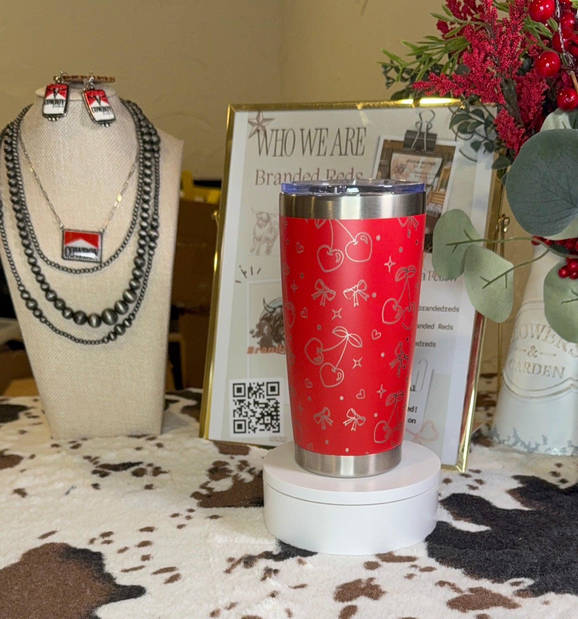 Durable and eye-catching, the engraved design won’t fade or peel, making it perfect for keeping your favorite drinks hot or cold—whether you’re headed to the ranch or out on the town. 🍒🎀