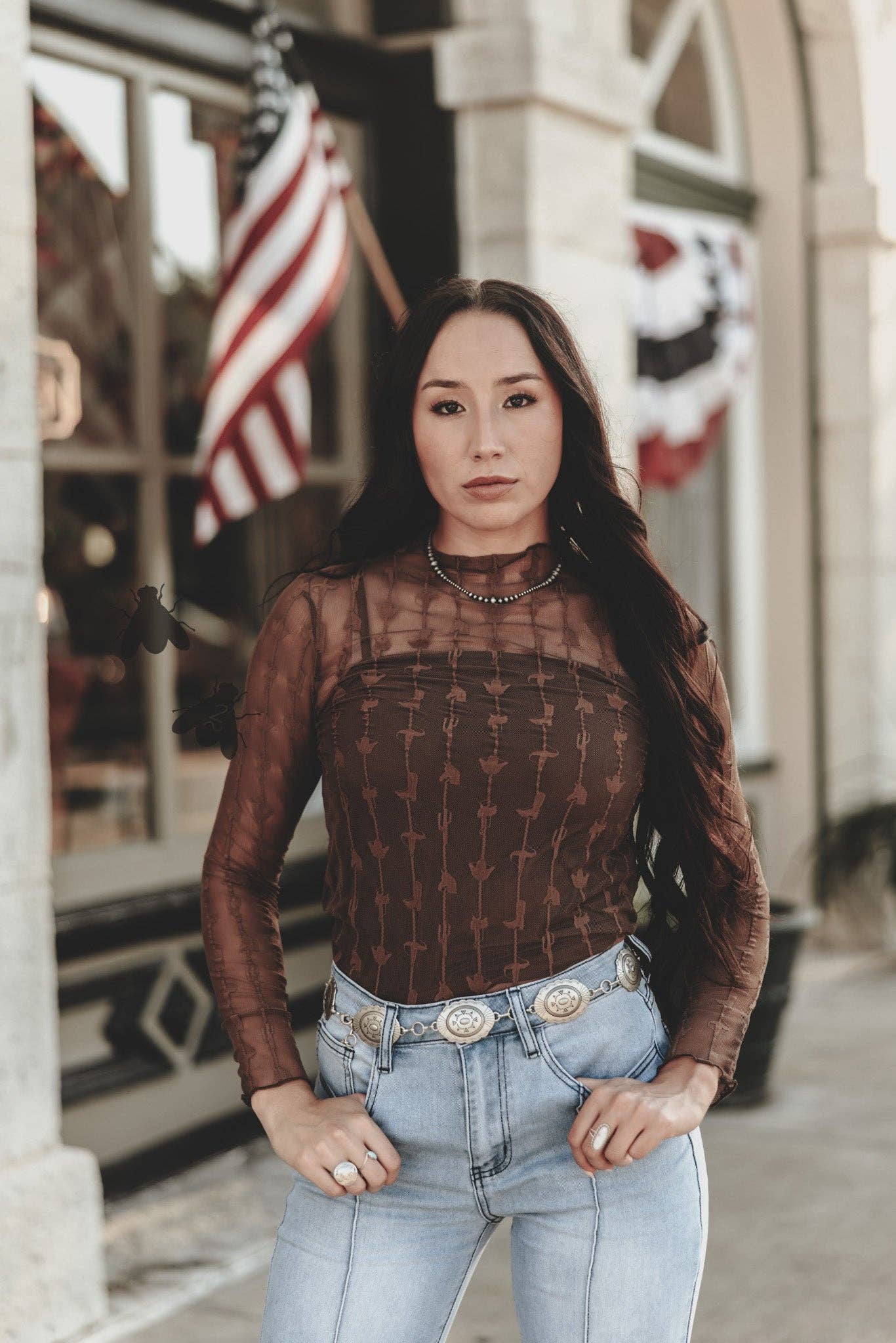 Meet the Lariat Lace Long Sleeve Top in a rich chocolate brown from 2 Fly Co—where Western meets weird in the best way.