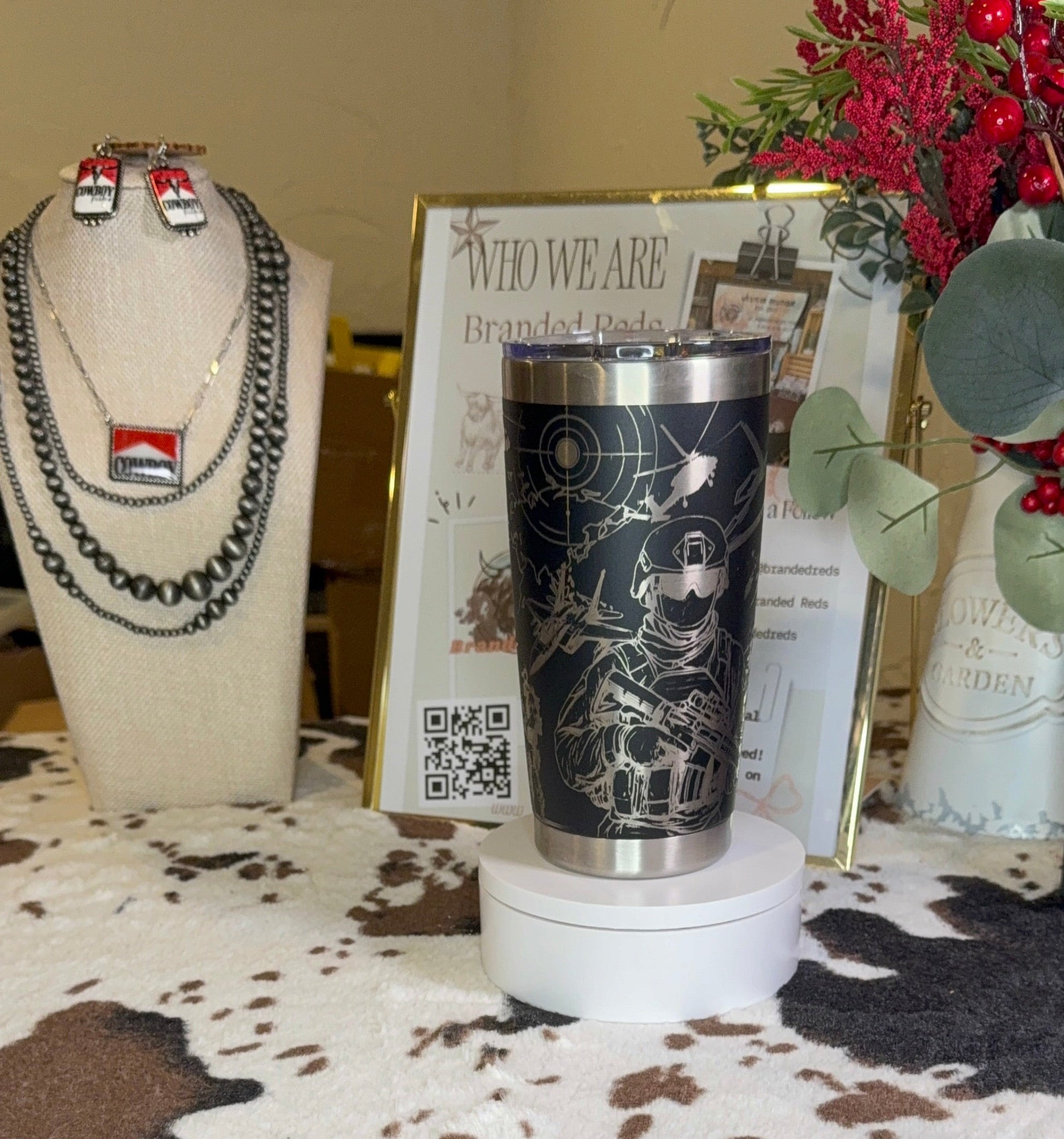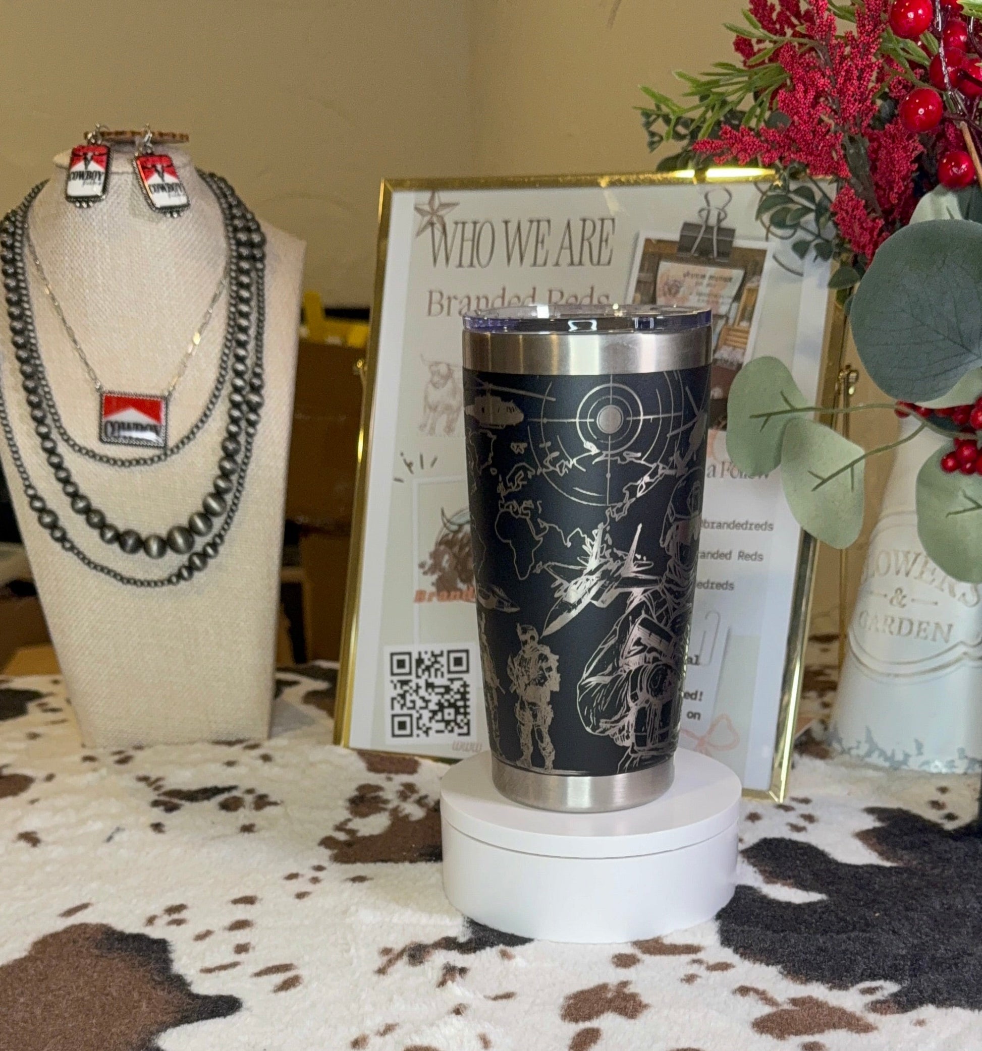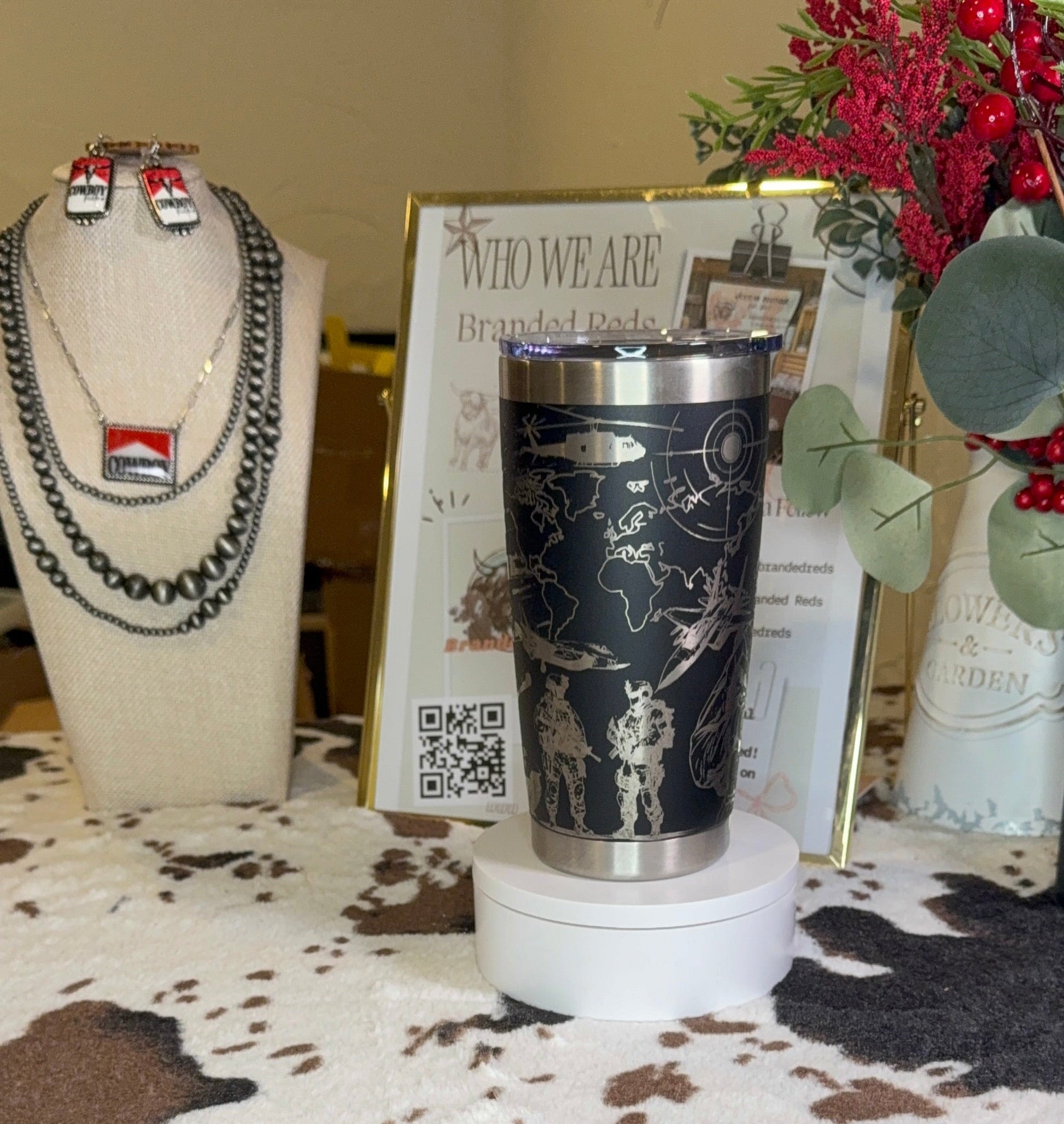 Show your patriotic pride with this 20oz stainless steel tumbler, featuring a detailed laser-engraved full wrap of military imagery—helicopters, targets, and service men in action.